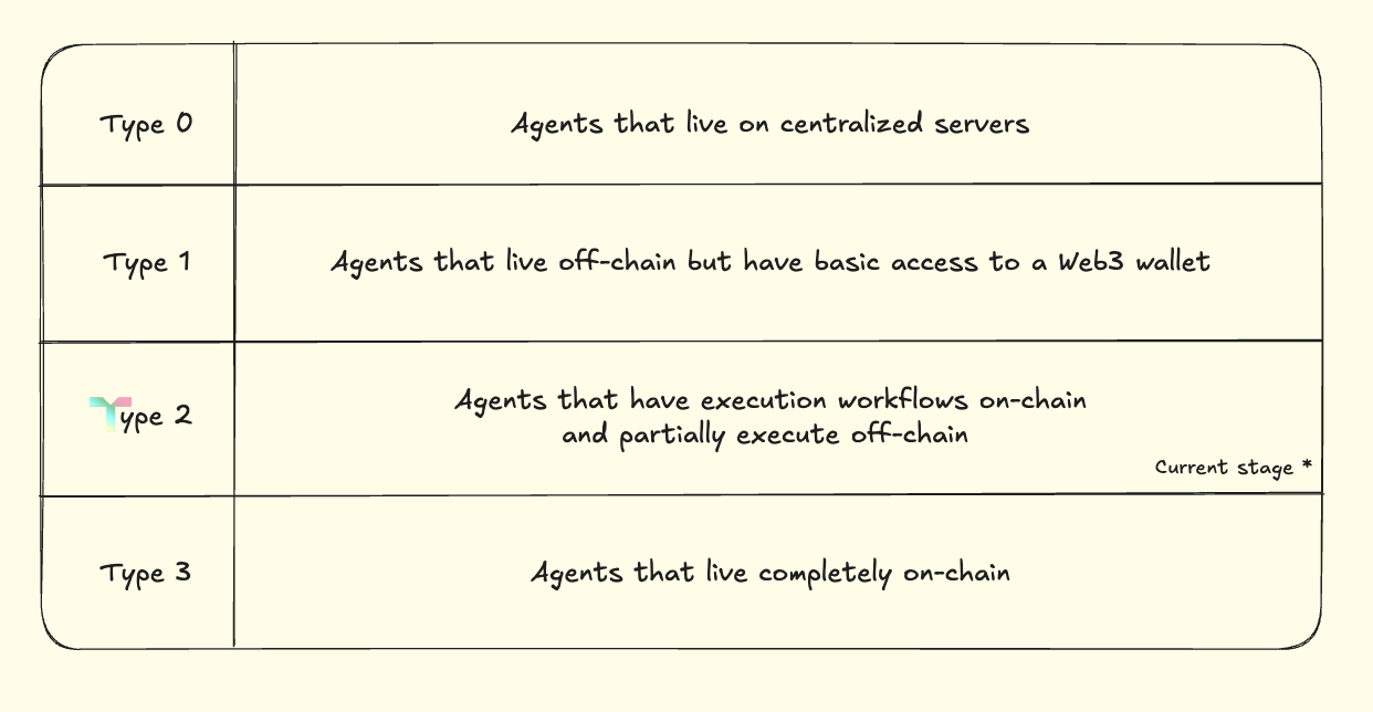 To overcome these challenges and enable an actual functional agentic ecosystem, an open, permissionless, and decentralized coordination layer is required, one capable of facilitating seamless interaction between agents, data, and users. Talus is the foundational layer built on top of Sui which serves as the coordination layer which provides decentralization and transparency. While blockchain technology addresses part of the problem, it alone is insufficient to resolve all the shortcomings of Web2-based AI agents. The philosophy of Talus centers on the belief that AI agents and the tools they utilize will evolve and mature progressively over time. They classify agents according to 4 different types as follows: