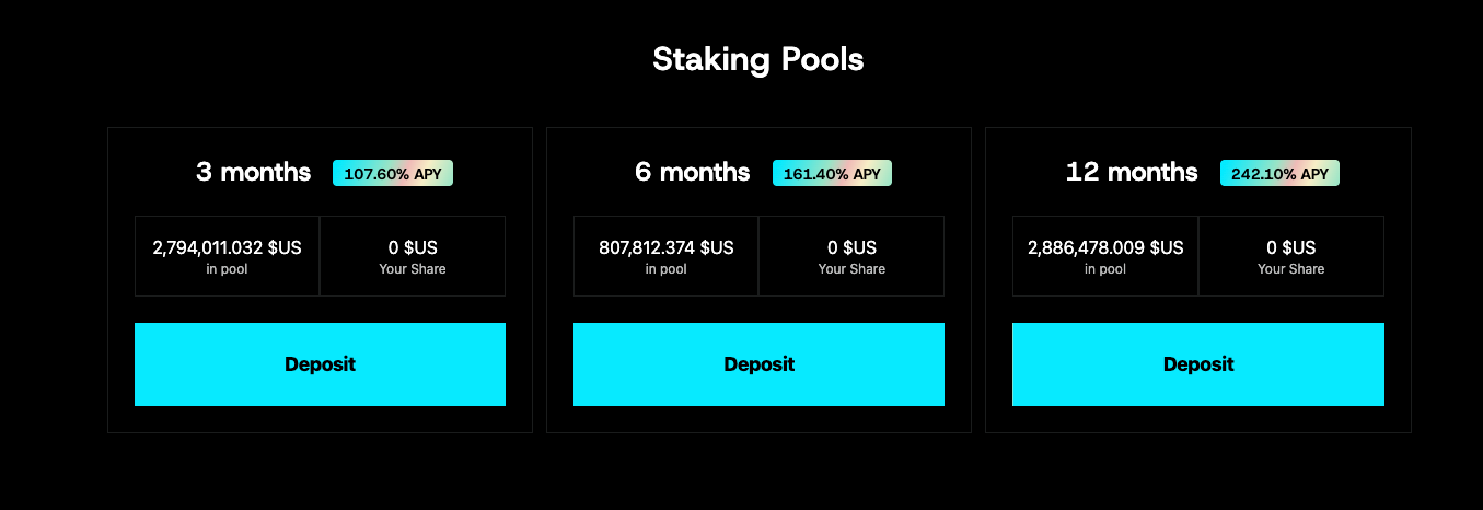 There are the 3 staking pools available: 3, 6 and 12 months and obviously, the longer you stake, the more $US tokens you’ll earn. Even though the staking period ends your stake will increase as long as you won’t be withdrawing your initial stake + earned tokens.