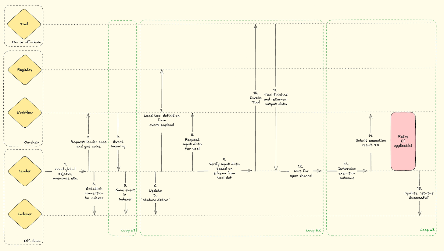 After the initial setup has been initiated the workflow is going to listen for incoming events which will be communicated to the leader and subsequently saved into the indexer. This event (depicted as event 4 and 5) actually can be looped as the workflow is continuously active to detect potential new events that need to be saved to the indexer. Meanwhile the Leader also checks for queued workflow events, retrieves input data, defines and executes with the required Tools, validates inputs and verifies outputs and subsequently sends the results back to the workflow that resides on-chain as soon as a channel is available. The maximum amount of gas coins and leader caps that are available is ultimately dependent on the caps that are chosen in step 2.