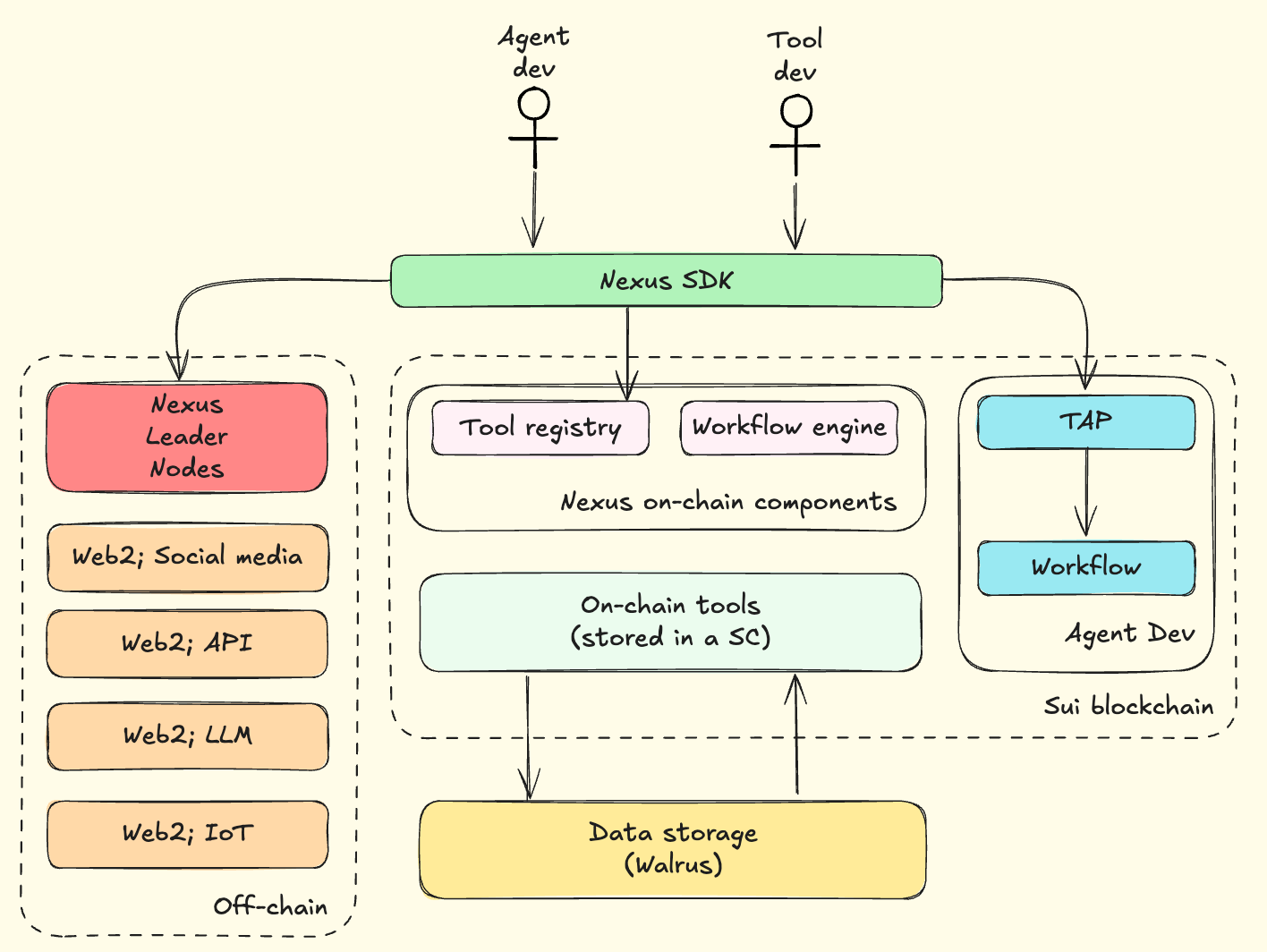 Now that all the components are clear that are essential to understand the Nexus framework, we can dive deeper into this architecture. On the one hand it’s a culmination of different components and actors that empower the Talus ecosystem. The Nexus Framework will be maintained by Talus Labs in the form of the Nexus Onchain Package (NOP).