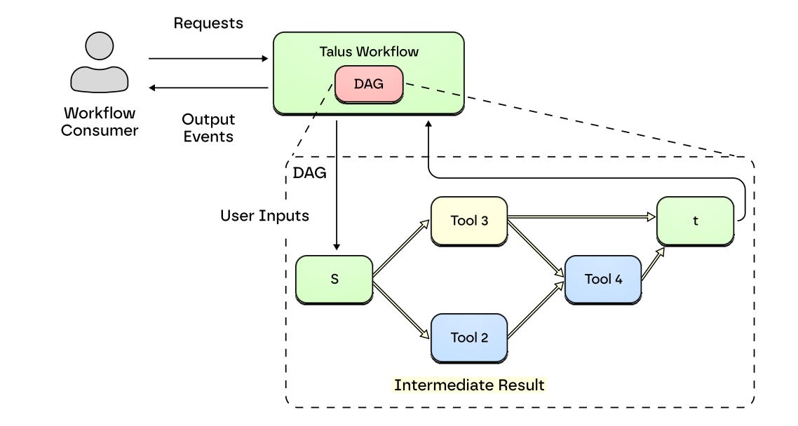 The image below provides a high-level overview of a typical Talus workflow. In this structure, the workflow processes user inputs by directing them to the necessary tools required to complete a given task, with multiple tools capable of operating in parallel when feasible. The workflow concludes once the final tool (represented as “t” in the diagram) completes execution or if any tool within the sequence fails. Each workflow is fully composable, meaning one workflow can be embedded within another. This composability allows for the creation of more complex and dynamic processes, where multiple workflows can converge, interact, and collectively produce optimized outcomes. When an agent executes a workflow, it is settled on-chain, ensuring that every action and result is fully transparent and verifiable.